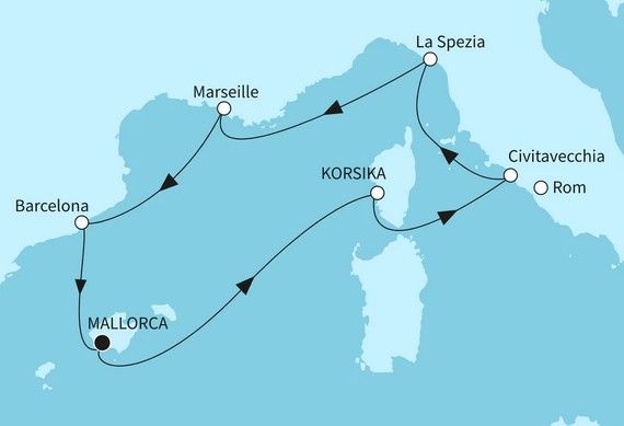 Reiseroute: ab Palma de Mallorca (Mallorca / Balearen / Spanien) - Seetag - Ajaccio (Korsika / Frankreich) - Civitavecchia / Rom (Italien) - La Spezia (Italien) - Seetag - Marseille (Frankreich) - Barcelona (Spanien) - 2 Tage Palma de Mallorca mit Liegezeit über Nacht