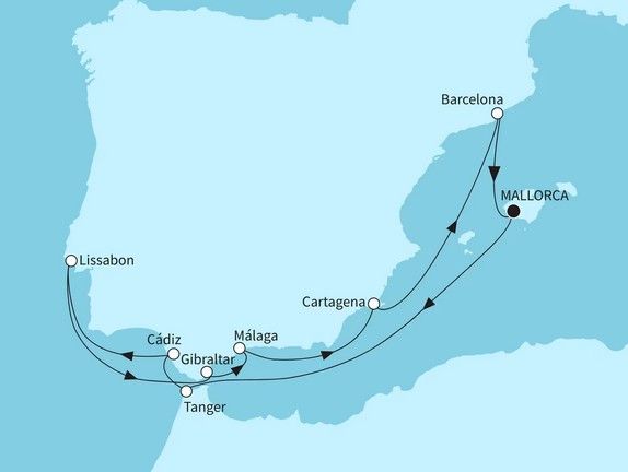 Reiseroute: ab Palma (Mallorca / Balearen / Spanien) - Seetag - Tanger (Marokko) - Cádiz (Spanien) - Lissabon (Portugal) - Seetag - Gibraltar (Britisches Überseegebiet) - Málaga (Spanien) - Cartagena / Murcia (Spanien) - Seetag - Barcelona (Spanien) - Palma