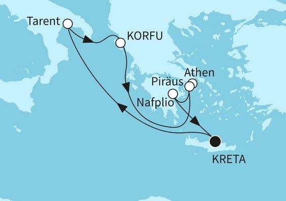 Reiseroute: Heraklion (Kreta / Griechische Inseln) - Seetag - Tarent (Italien) - Korfu Stadt (Korfu / Griechische Inseln) - Seetag - Piräus / Athen (Griechenland) - Nafplio (Peloponnes / Griechenland) - Heraklion (Kreta)
