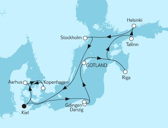 Reiseroute: ab Kiel (Deutschland) - Seetag - Gdingen / Danzig (Polen) - Visby / Gotland (Schweden) - Riga (Lettland) - 2 Tage Tallinn (Estland) mit Liegezeit über Nacht - Helsinki (Finnland) - Stockholm (Schweden) - Seetag - Århus (Norwegen) - Kopenhagen (Dänemark) - Kiel