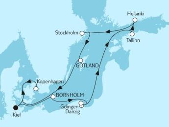 Reiseroute: ab Kiel (Deutschland) - Rønne / Bornholm (Dänemark) - Gdingen / Danzig (Polen) - Seetag - Tallinn (Estland) - Helsinki (Finnland) - Stockholm (Schweden) - Visby (Gotland) - Seetag - Kopenhagen (Dänemark) - Kiel
