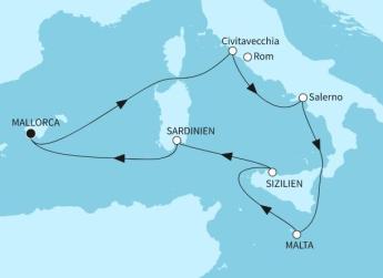 Reiseroute: ab Palma de Mallorca (Balearen / Spanien) - Seetag - Civitavecchia / Rom (Italien) - Salerno (Italien) - Seetag - Valletta (Malta) - Palermo (Sizilien) - Cagliari (Sardinien) - Seetag - Palma de Mallorca (Balearen)