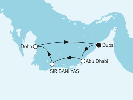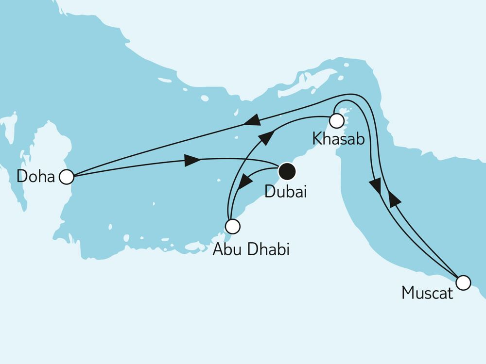 Orientalisches Flair, Wüste und atemberaubende Skylines - diese Mein Schiff Dubai Kreuzfahrten werden Sie begeistern! Erleben Sie diese TUI Cruises Dubai Kreuzfahrt mit Bahrain ganz entspannt an Bord der Mein Schiff 2 und lassen Sie sich grenzenlos verwöhnen! Bei dieser einmaligen Reise Dubai mit Bahrain erwartet Sie die Stadt Dubai als Start- und Zielhafen, inklusive 2 Übernachtungen im Hafen von Dubai, mit ihren modernen Bauten, Khasab in einmaliger Lage zwischen Wasser und Wüste, das Emirat Abu Dhabi und das königliche Bahrain. Mein Schiff Kreuzfahrten Dubai, lassen Sie sich überraschen!