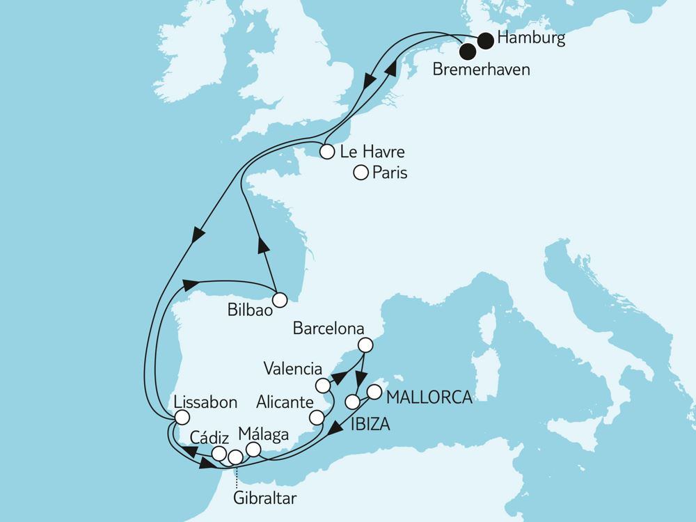 Reiseroute: Bremerhaven (Deutschland) - 3 Tage Wohlfühltag auf See - Lissabon (Portugal) - Seetag - Alicante (Spanien) - Valencia (Spanien) - Barcelona (Spanien) - Ibiza Stadt / Ibiza (Balearen / Spanien) - Palma de Mallorca / Mallorca (Balearen / Spanien) - Seetag - Málaga (Spanien) - Gibraltar - Cádiz (Spanien) - Lissabon (Portugal) - Seetag - Bilbao (Spanien) - Seetag - Le Havre / Paris (Frankreich) - Seetag - Hamburg (Deutschland)